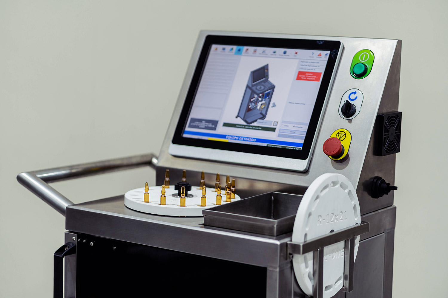 Esto se complementa con el sistema de inspección automática, encargado de corroborar la información contenida en el código mediante la captura rápida del lector de códigos 2D y su inmediata incorporación en la base de datos para el seguimiento de stock de unidosis.
